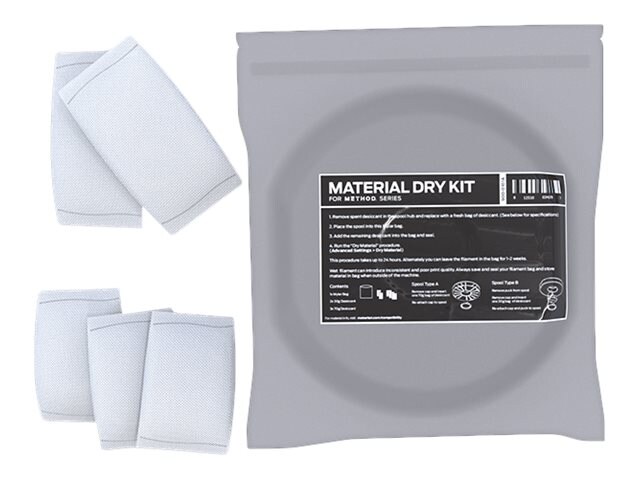The Dry Kit comes with a mylar bag filled with fresh desiccant. Just insert your Smart Spool into the bag, reseal the bag and place it onto the bed of your METHOD 3D printer, run the METHOD Dry Cycle, within 24 hours your spool will be fresh and ready to print reliable, dimensionally accurate parts.