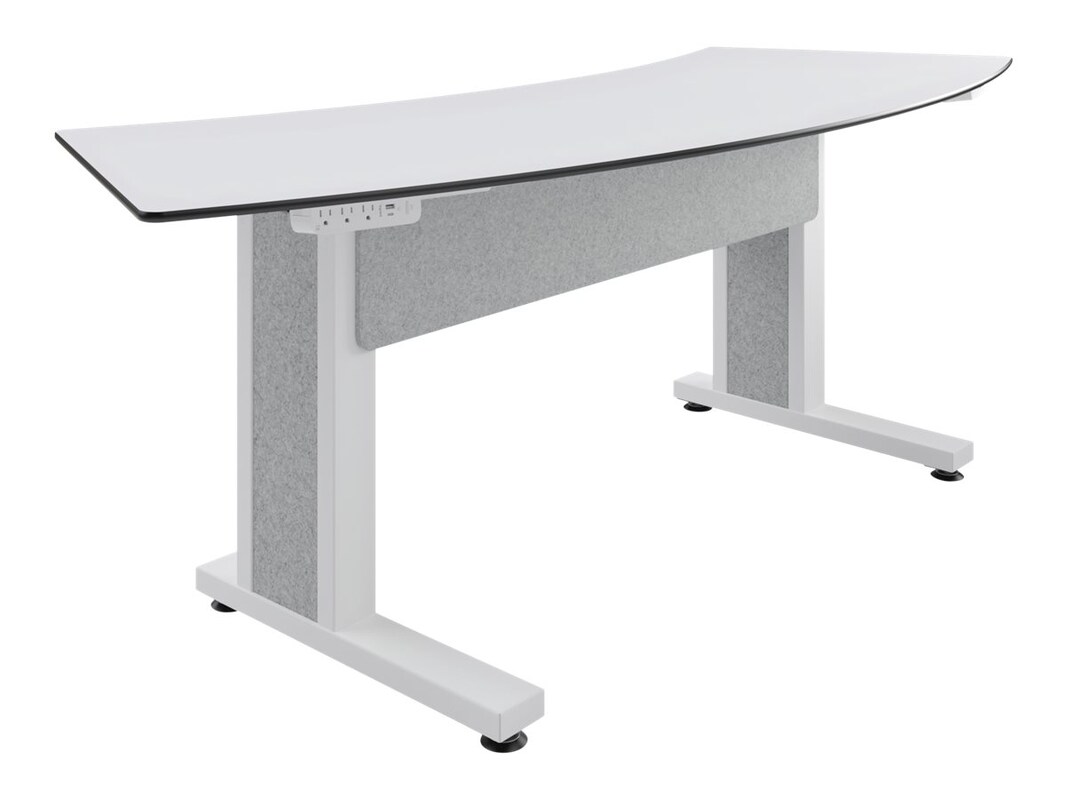 The Forum Arc shaped table allows for all in-person participants to directly face the remote participants during videoconferencing calls. Supports 3 people 30" sitting height table Easily connect multiple Arc tables together for larger groups Table top manufactured in Designer White compact laminate for a ultra thin, durable worksurface that can withstand day-to-day meetings and is easily cleaned after each use Built in cable management within the table legs and underneath the worksurface for clean lines and no cord clutter Cable management covers are manufactured in Silver Gray acoustic felt material (PET) Table legs are powder coated in white Add optional Wiremold ModPower modular power system for device charging hubs at the users seat eBook: Adaptable Spaces See how this product can be adaptable for changing AV needs within conferencing spaces. Explore the eBook.