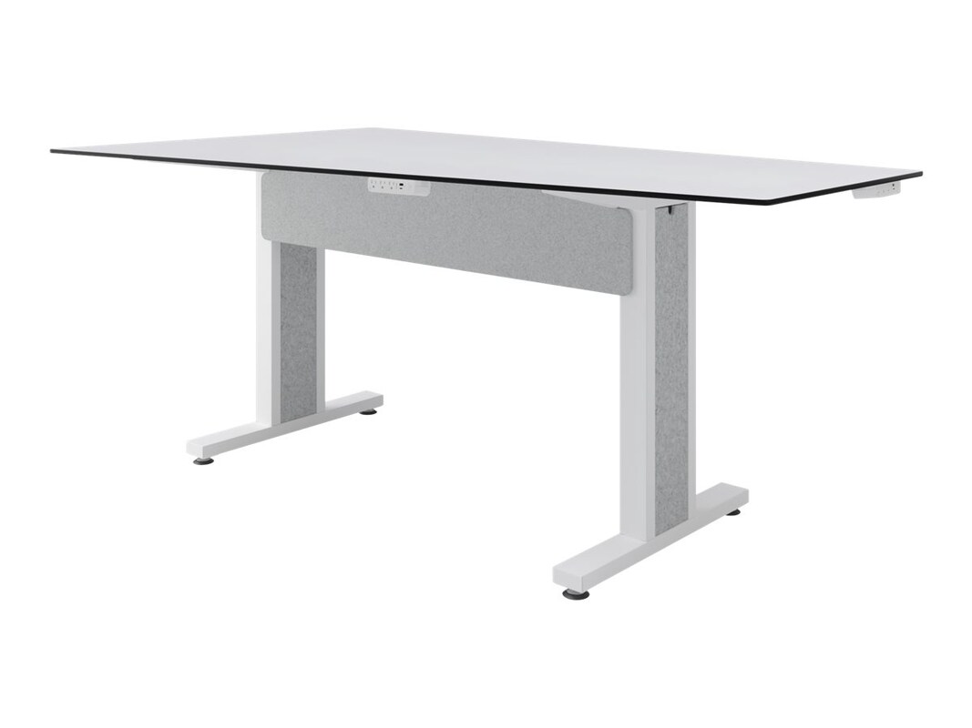The Forum Angle shaped table allows for everyone's face to be seen by the remote participants and still easily interact in-person for meeting equity Supports 5 people 38" counter height table Table top manufactured in Designer White compact laminate for a ultra thin, durable worksurface that can withstand day-to-day meetings and is easily cleaned after each use Built in cable management within the table legs and underneath the worksurface for clean lines and no cord clutter Cable management covers are manufactured in Silver Gray acoustic felt material (PET) Table legs are powder coated in white Add optional Wiremold ModPower modular power system for device charging hubs at the users seat.