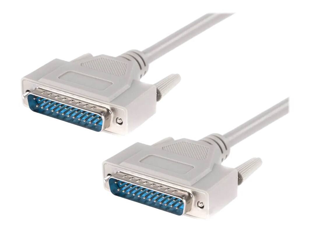 This parallel printer cable features a DB25 male connector on each end. Each pin provides a straight through connection to the same pin number on the other end. The connector heads are molded onto the cable and each end has thumbscrews for securing the connectors to the DB25 ports.