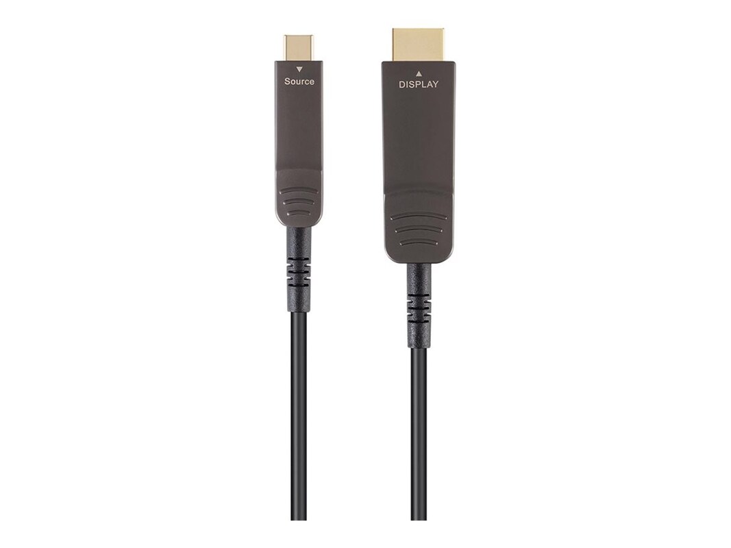 The Monoprice SlimRun AV is a video adapter cable designed to provide seamless connectivity between devices. With a transmission distance of up to 100 feet, it ensures a reliable connection for both near and far setups. This fiber optic cable utilizes Active Optical Cable technology, offering a data rate of 21.6 Gbps and Dynamic HDR support for vibrant images and detailed visuals. Featuring a 24-pin USB-C connector on one end and a 19-pin HDMI Type-A male connector on the other, the SlimRun AV cable is lightweight and easy to handle, making it a solution for various AV applications. The gold-plated connectors enhance durability and minimize signal loss, while its polymer jacket provides additional protection and flexibility for everyday use.