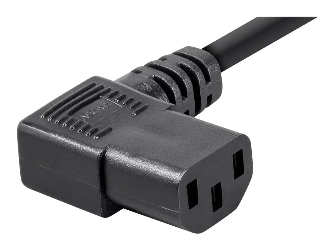 The North America NEMA 5-15 plug to IEC 60320 C13 female connector power cord works with most PCs, monitors, scanners, and printers. The angled power cord features a 90-degree C13 connector (PC side), which allows for better placement in tight situations. They are made to the same stringent standards as are standard PC power cables with the convenience of an angled connector.