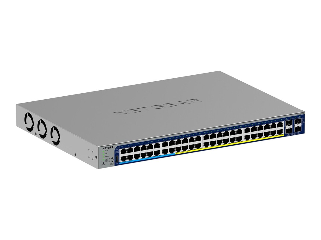 The NETGEAR GS752TXUP is a switch designed for high-performance networking needs. With a total of 48 ports, including support for PoE++ across 16 10/100/1000 ports, this switch ensures efficient power delivery to devices while maintaining optimal connectivity. The management capabilities, including support for various protocols such as SNMP and RMON, make it suitable for both small and extensive network configurations. This device provides features such as VLAN support, IGMP snooping, and Dynamic ARP Inspection, enhancing network security and performance.