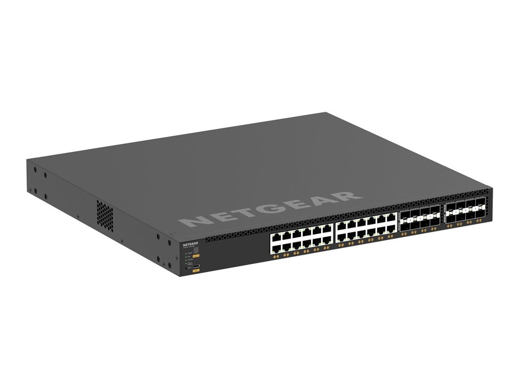 The NETGEAR M4350 Series switch is designed to meet the needs of modern networks, offering a blend of performance, security, and manageability. With 24 RJ-45 and 16 SFP+/SFP28 connectors, it provides flexible connectivity options for 10G and 25G networks. The switch's Layer 3 switching capabilities, combined with a suite of network management features, ensure efficient network operation and easy management. Security is a priority, with support for multiple authentication methods and robust access control measures. Additionally, the switch's high-capacity PoE budget of 1170 W, along with PoE++ support, makes it capable of powering a wide range of devices, further enhancing its utility in diverse network environments. Its support for jumbo frames and a high-performance internal power supply ensures efficient data handling, making the NETGEAR M4350 Series a choice for businesses looking to optimize their network performance and security.