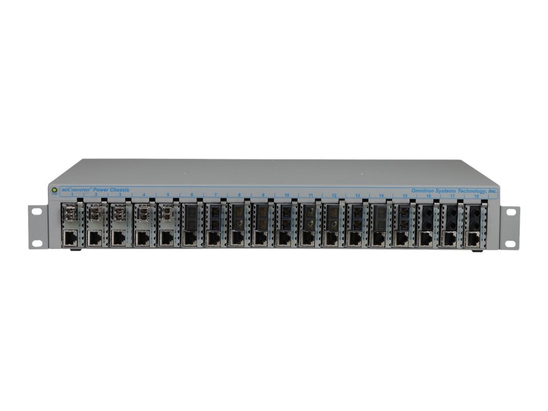 The miConverter 18-Module Power Chassis is a cost-effective mounting and powering solution for miConverter miniature media converters. This compact chassis is ideal for consolidating individual media converters into a high-density, rack mountable form factor. It can be deployed in service provider, Enterprise and Government applications where fiber optic links are distributed from UTP switch equipment. The miConverter chassis is ideal for fiber-to-the-desk, Campus LAN/WAN fiber networks and hybrid copper/fiber networks.