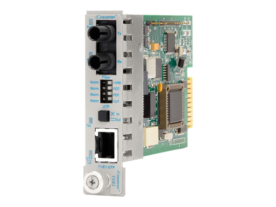 The iConverter T1/E1 manageable media converter is a member of the modular iConverter product family. It provides T1/E1 Copper to Fiber conversion. The fiber port supports single-mode (SM) or multimode (MM) fiber with distances up to 120km. The RJ45/RJ48 port supports T1/E1, and a DCE/DTE switch eliminates the need for a crossover cable and facilitates connectivity to devices such as PBXs and CSUs.