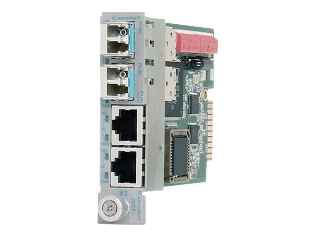 IConverter 2GXT Ethernet fiber media converters are members of the modular iConverter Multi-Service Platform. The 2GXT is a dual-channel media converter and four-port switch with two 10/100/1000BASE-T RJ-45 ports and two Small Form Pluggable (SFP) ports. The dual SFP fiber ports can be configured to provide 1:1 uplink protection with less than 50ms switchover when the 2GXT is deployed as a four-port switch.