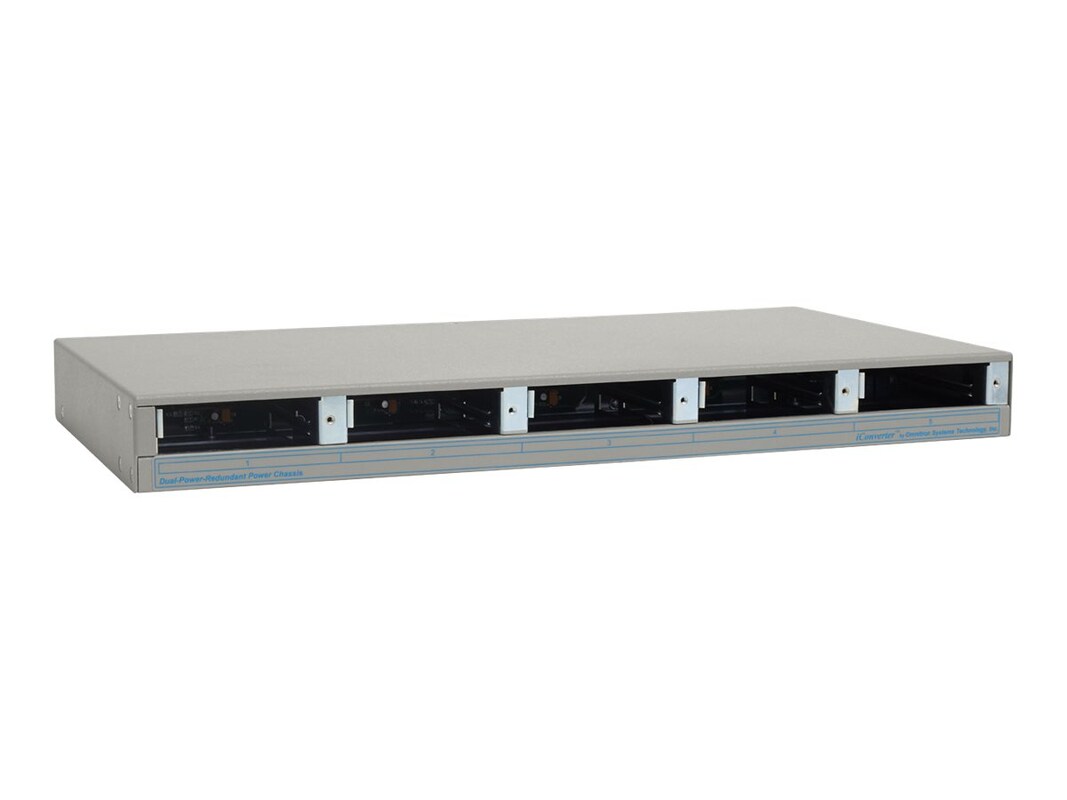 The 1U (1.75-inch) high iConverter 5-Module Chassis has redundant power supplies and can be mounted in a 19-inch or 23-inch rack. It is designed for Enterprise Local Area Network (LAN) and Metropolitan Area Network (MAN) applications where fault tolerance and reliability are essential.