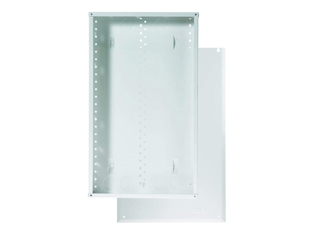 This 20" enclosure universal On-Q bay-style mounting holes that are compatible with all bay-style modules. It also includes larger top openings that make pulling wire easier as well as additional knockouts, more side lances, and side tabs for more flexible mounting. It includes a screw-on cover.