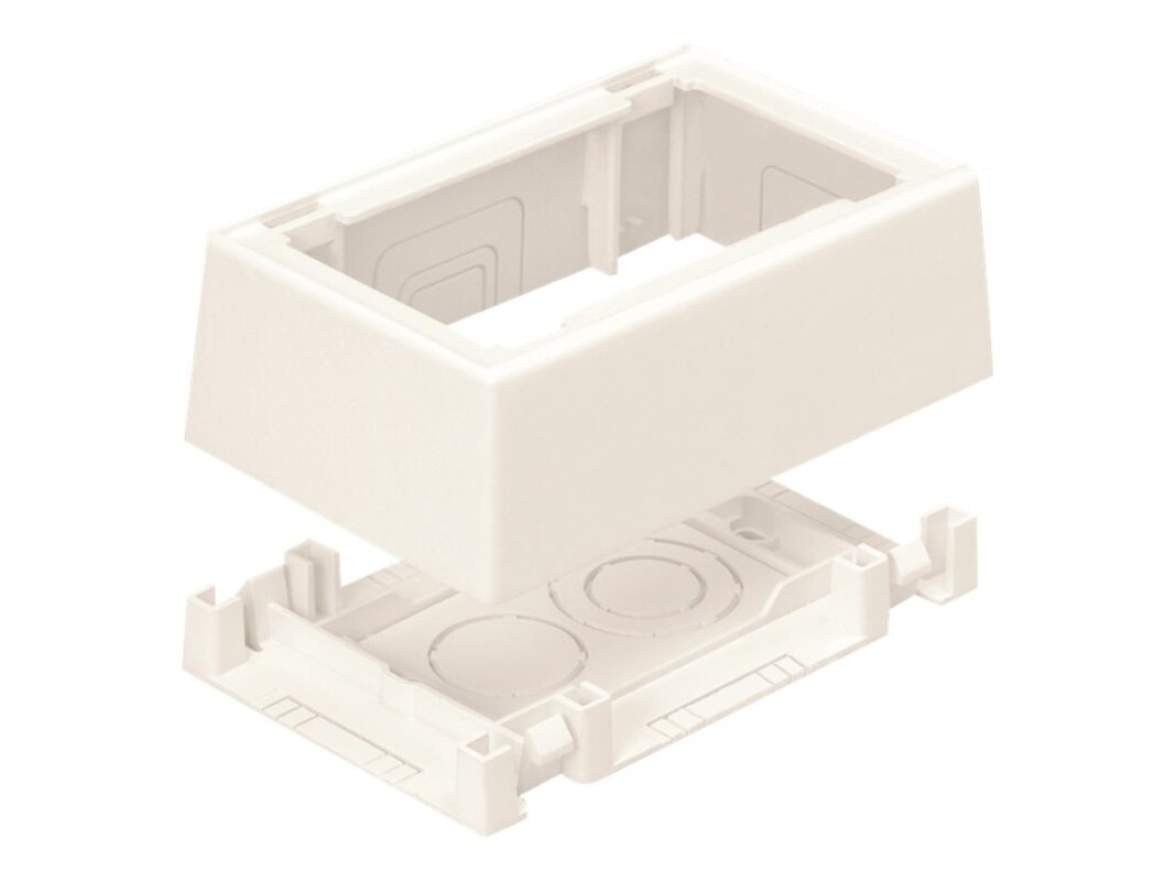Single gang two-piece snap together outlet box with adhesive backing. Box accepts Pan-Way Screw-on Faceplates or any NEMA standard single gang faceplate. For use with Pan-Way or LD profile raceway.