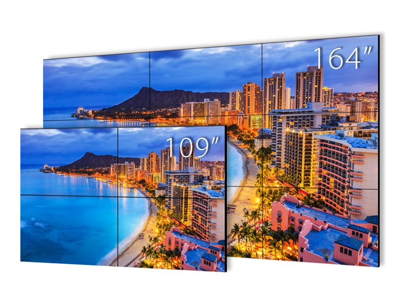 The Planar VM Complete VMC55MXM4 video wall features four 55-inch LCD video wall displays in a 2x2 landscape configuration, with tiled bezel widths of 0.88 millimeters. With a diagonal video wall size of 109 inches, and 700-nit brightness, it is ideal for any retail store, hospitality setting, or corporate lobby.