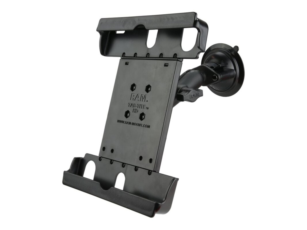 Ideal for aircraft windshields, the RAM Tab-Tite holder for 9"-10.5" tablets with a case consists of a 3.3" diameter RAM Twist-Lock suction cup base and medium length double socket arm. The mount is designed with a RAM 1" diameter B size patented rubber ball and socket system that has adjustment points at both ends of the double socket arm, allowing for almost infinite adjustment and perfect viewing angles.