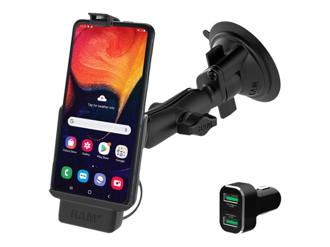 This waterproof RAM EZ-Roll'r powered cradle bundle is designed specifically for the Samsung Galaxy XCover Pro, includes a GDS 2-port USB cigarette charger with Qualcomm Quick Charge capabilities, and features two integrated pogo pins that provide charging capabilities to the device. While keeping the XCover Pro secure, the RAM EZ-Roll'r powered cradle also leaves the device's buttons and cameras exposed and usable. Ideal for windshield mounting, this bundle also includes a diamond ball base, medium-length RAM double socket arm, and a RAM Twist-Lock suction cup.