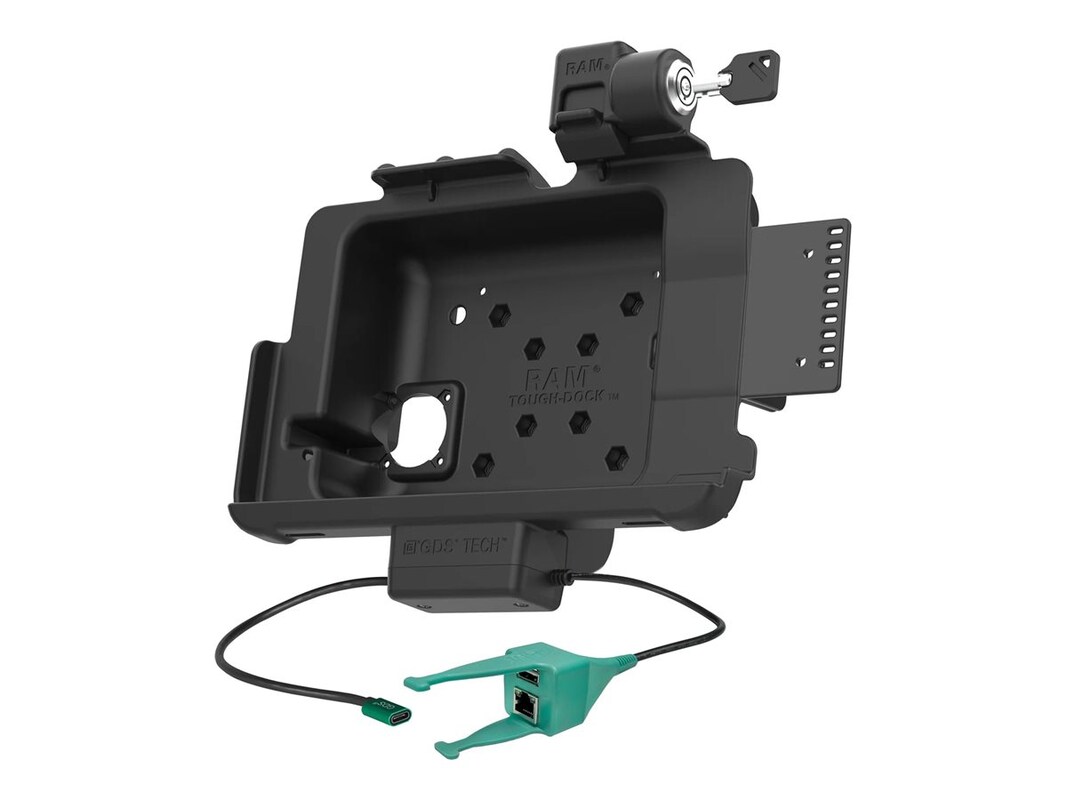 The National Products RAM GDS docking station is designed for tablets, featuring a compact and integrated USB-C cable for easy connectivity. At a length of 21.5 cm, it allows for quick setup, ensuring that your devices remain linked with minimal clutter. The station supports network and USB interfaces, accommodating multiple connection types, including a 4-pin USB Type-A and an RJ-45 connector. It also provides 15 watts of power to keep your devices charged while in use.