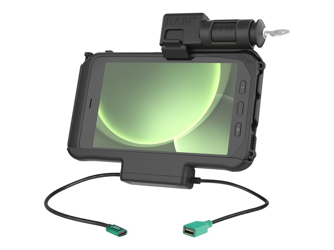 The RAM EZ-Roll'r charging cradle is an essential power dock for tablets, providing a reliable and efficient charging solution. Constructed from high-strength composite material, this cradle features a key locking mechanism for enhanced security, ensuring that the tablet remains securely in place while charging. With dual input connector options, including a 4-pin USB Type-A and a 24-pin USB-C, this cradle allows for versatile connection choices to suit various devices.