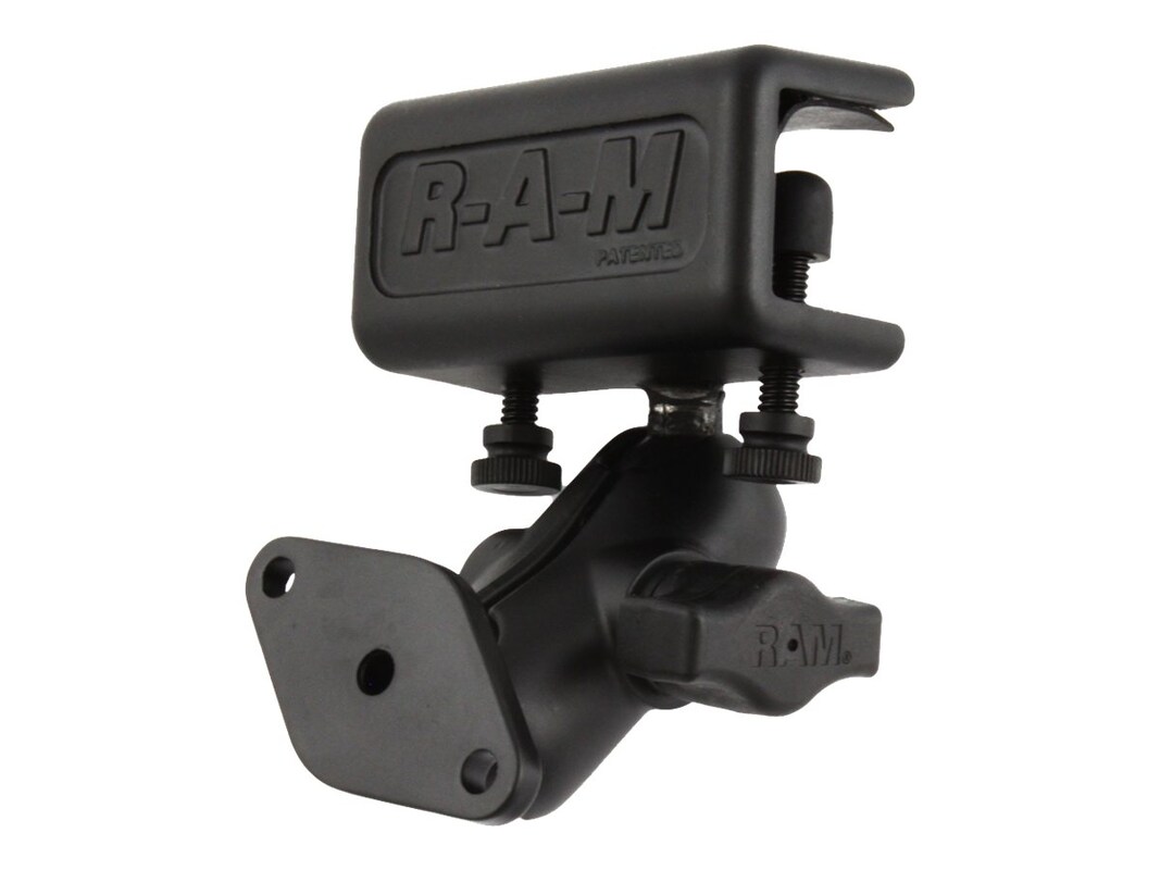 The RAM-B-177U consists of a double socket arm, glare shield clamp base and diamond base adapter. The RAM-B-177U is designed to mount to the lip edge of a flat surface up to 1" thick. Popular mounting edges include a car side window edge lip or glare shield on an airplane. The base has two composite bolts that, when tightened, clamp the base to the lip surface. A RAM 1" diameter rubber ball is connected to the base allowing you to connect a RAM 1" diameter arm socket and connection plates to create the perfect mount for your application. The hole pattern found on the diamond base adapter will connect to most RAM cradles.