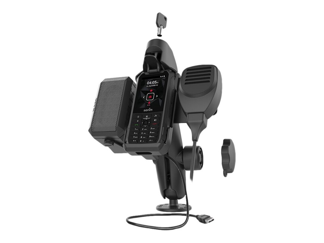 This Sonim XP5s bundle includes the RAM EZ-Roll'r Powered Key Locking Cradle for Sonim XP5s, double ball mount with RAM Pin-Lock Security Knob, and a mounting bracket containing a speaker and microphone. This bundle secures your Sonim XP5s and keeps your peripherals together and connected as one unit. The powered cradle features two integrated pogo pins that provide charging capabilities to the device through a male USB Type-A connector, and includes key lock for extra security and peace of mind. The provided speaker connects to the Sonim unit using an included 10-pin to 3.5 audio adapter cable.