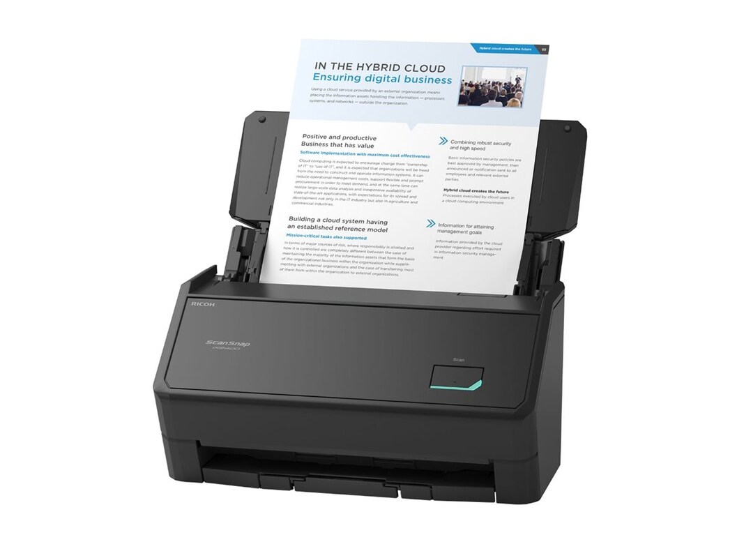 This scanner features automatic duplexing, enabling double-sided scanning without manual intervention. The Ricoh iX2400 can scan in both color and black and white at speeds up to 45 pages per minute. With the added functionality of scan to cloud, users can easily store and share scanned documents. Features like Blank Page Removal and Multi-Feed Detection enhance the scanning experience, providing effective handling of document needs.