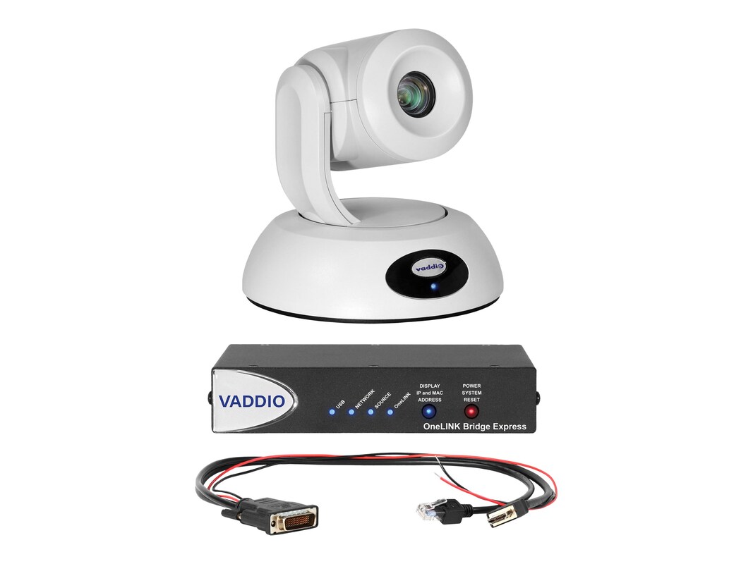 Combine the RoboSHOT 12E HDBT camera and the Polycom codecs to soft conferencing applications with the OneLINK Bridge Express receiver. This bundle includes RoboSHOT Elite Series camera, necessary Polycom cables, and OneLINK Bridge Express. Recommended for large conference rooms, training rooms and classrooms that are connecting to a Polycom RealPresence codec. Key Features: 12x Optical Zoom 1/2.5-type Exmor R CMOS sensor 70.2° horizontal field of view Simultaneous HDbaseT, HDMI and IP H.264 streaming Remote IP Management Simple, clutter-free camera extension with HDBaseT technology Power, video and control over a single Cat-5e cable up to 230 ft. (70m), or over a Cat-6 cable up to 328 ft. (100m) Bridges audio and video for easy soft-client conferencing Simultaneous HDMI, USB 3.0, and IP Streaming Configurable audio matrix with AEC Up to 1080p/60 resolution available over uncompressed USB New! Vaddio Deployment Tool Simplify installations by viewing all your Vaddio products across a deployment on one screen with the simple click of a button. The Vaddio Deployment Tool enables you to select devices from the network, choose an action like rebooting the device, unmute the audio, or updating firmware and voilà ! â€" remote troubleshooting success. You can even conduct mass firmware updates on hundreds of devices all at once, which saves you a lot of time. Download the Deployment Tool > Introducing the RoboSHOT Elite Series â€" Vaddio†s next generation of professional cameras. Designed with an 1/2.5-type Exmor R CMOS sensor, RoboSHOT Elite cameras deliver striking, high-definition video image quality. Cutting-edge image signal processing (ISP) results in better light-gathering capabilities, incredible contrast and sharp 1080p/60 video, even in dim lighting conditions. RoboSHOT Elite cameras are equipped with enhanced wide dynamic range, which can help correct for environments with uneven lighting by making darker or over-bright areas in video more visible and detailed. Enjoy IP streaming (RTSP or RTMP format with H.264 compression) to share live events like church services, lectures, or meetings over popular applications like YouTube, Livestream and Facebook. A web-based user interface gives the user camera control with a web browser from anywhere in the world over the IP network. To watch the IP stream, simply enter the camera†s streaming URL into any standards based (H.264, RTSP format) media player. Perfect for remote management, network operating centers and overall IT control. The Elite Series of RoboSHOT PTZ cameras is equipped with Vaddio†s industry-leading Tri-Synchronous Motion technology allowing all three axes of the camera to move simultaneously for ultra-smooth, natural camera motion. The RoboSHOT 12E cameras are recommended for small to medium spaces such as conference rooms, training rooms, and classrooms that require a wide angle of view. OneLINK Bridge Express connects a non-USB camera and audio source, and bridges to a USB stream for easy connection to USB-based conferencing applications such as Microsoft Teams, Google Meet, and Zoom. Along with the bridging capabilities, the system†s OneLINK Bridge Express Receiver for HDBaseT Cameras extends HD video, 100BaseT Ethernet, RS-232, and power up to 328 ft (100 m) on a single Cat-5e/6 cable. This Package Includes: RoboSHOT 12E HDBT camera (black or white) Thin Profile Wall Mount (black or white) with mounting hardware and installation manual Vaddio IR Remote Commander OneLINK Bridge Interface 48V power supply with AC cord set(s) 4 qty 3-position phoenix-style connectors 2 ft. (0.6m) fan-out cable for Polycom, codec side 6 ft. (1.8m) USB 3.0 cable, type A to B EZCamera RS-232 Control Adapter Application Note: Using RoboSHOT Series Cameras with Polycom Codecs.