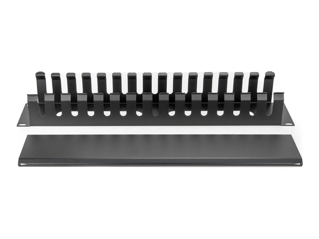 Optimize rack organization with the Rocstor rack cable management panel, designed to streamline and tidy up your workspace. This horizontal panel features a finger duct with cover, ensuring that cables are neatly routed and protected from wear and tear. The sturdy construction made of plastic and steel is complemented by RoHS and EIA RS-310-D compliant standards, ensuring a reliable installation that meets standards.