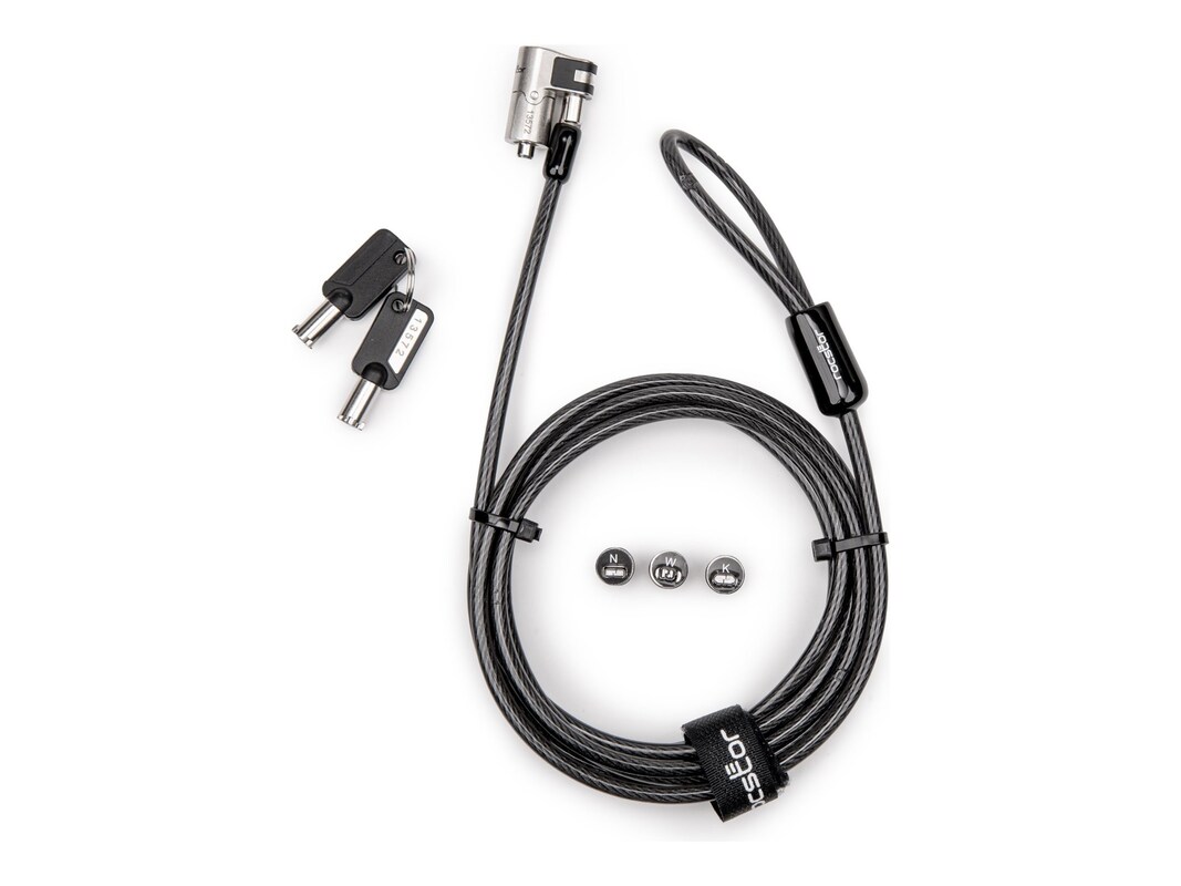The Rocstor security cable lock offers a reliable solution for securing laptops and notebooks. Designed with versatility in mind, this lock features a 3-in-1 mechanism that accommodates various lock types, including nano, standard, and noble wedge. The 360° rotation enhances usability, allowing you to position the lock for the most convenient access angle. Constructed from durable carbon steel and plastic materials, this cable lock ensures robust protection for your essential devices. With two included keys, the Rocstor security cable lock is easy to use and provides peace of mind whether at home, in the office, or on-the-go. Its compliance with TAA regulations further underscores its quality. Protect your valuable assets with this dependable locking solution, designed for notebook security.