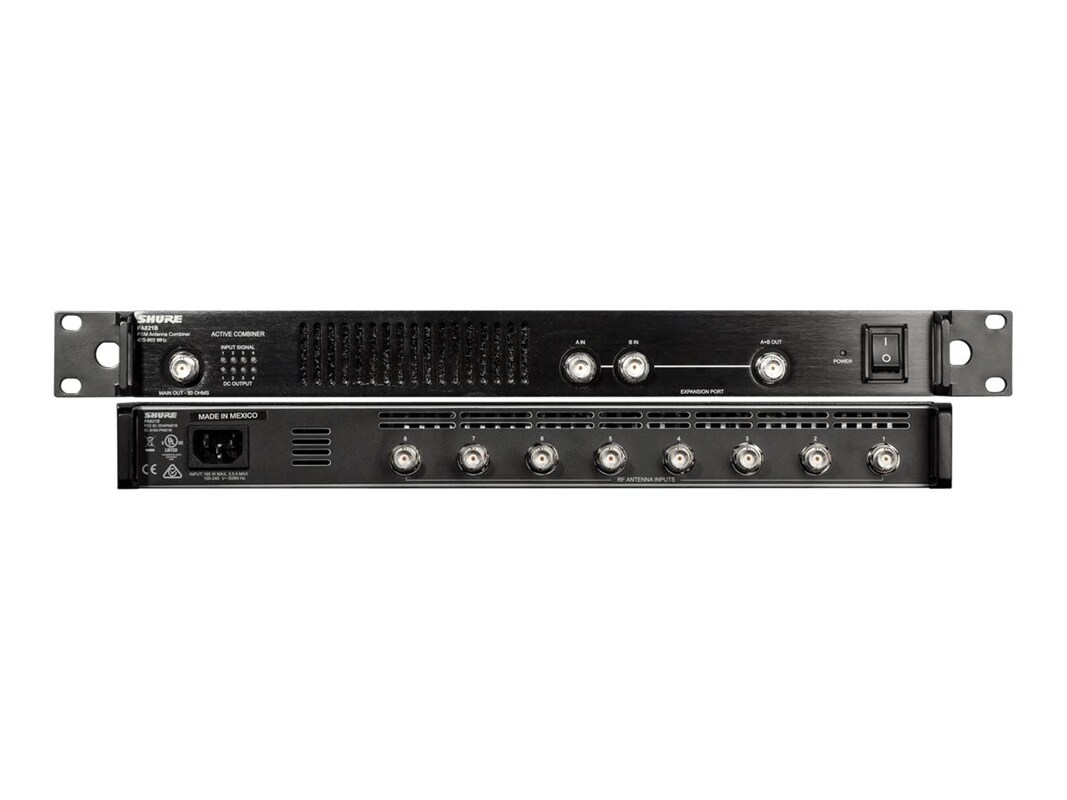 The PA821B active broadband antenna combiner streamlines the simultaneous operation of many PSM systems at a venue. The PA821B combines the RF outputs from up to eight PSM transmitters into one RF output to feed a single transmit antenna. This provides significantly improved reception quality due to reduced intermodulation distortion and dropouts due to multipath interference.