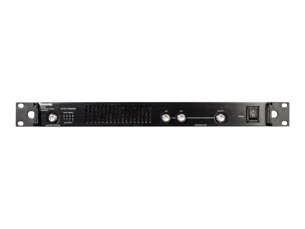 Shure antenna combiners actively combine RF outputs from multiple wireless IEM transmitters to a single antenna, improving RF performance and conserving rack space.