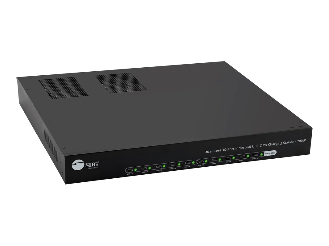 The SIIG charging station combines functionality and efficiency with its dual core and industrial design. It provides various voltage options including 5 V, 9 V, 12 V, 15 V, and 20 V, making it versatile for a range of devices. With a powerful output of 700 watts and 10 USB-C connectors, it is capable of charging multiple devices simultaneously, meeting the demands of any workspace. Safety is a priority with built-in protections against short circuits, overheating, overvoltage, and overcurrent, ensuring safe operation. The charging station also features temperature control and LED indicators for operational status. Compliant with UL, FCC, RoHS, and CP65 standards, this charging station is constructed from durable metal, ensuring reliability and longevity.