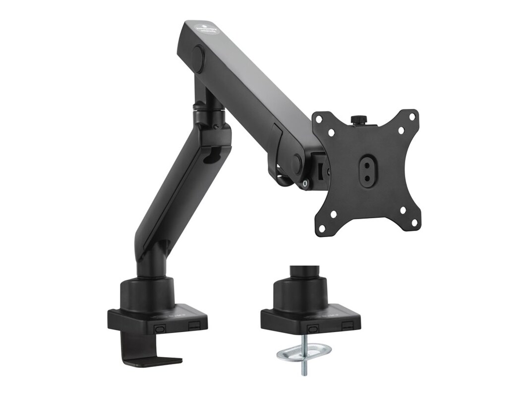 Premium quality adjustable spring assisted articulating monitor arm provides smooth, precise and effortless monitor viewing angle and height adjustment. Rotating VESA plate supports landscape or portrait monitor orientation. Supports 17" to 32" displays (screen size measured diagonally) weighing up to 17.6lbs. Compatible with VESA mounting patterns 75 x 75 and 100 x 100 mm. Supports 180° arm swivel, tilt angles of +/-90° (up/down), and 90° pan angles (left/right). Both C-clamp and grommet mount bases are included, easily and quickly installs onto most of desks or tables. Removable VESA plate for quick and easy monitor installation. Heavy-duty C-clamp is compatible with desk surfaces from 0.4" to 2" in thickness and grommet mount fits through surface hole from .40" to 2.25" wide and up to 2" thick. Integrated cable management system keeps cables neat, organized, and out of the way.