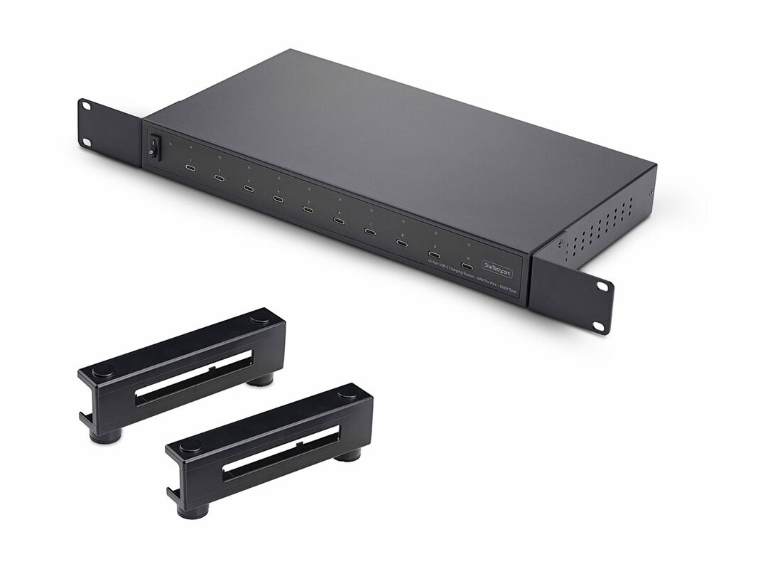 Rack Mount or Desktop Use: Multiport Charger includes rack mounting ears for 19in racks and rubber-gripped desktop feet for stable placement; Stackable design allows multiple units to be layered for expanded capacity without the extra clutter