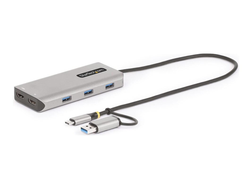 This USB Type-C & USB Type-A Multiport Adapter turns almost any laptop or desktop into a high-productivity workstation. It supports dual-external HDMI. The Mini Dock features a 3-port USB hub. It has a built-in 1.3ft (40cm) USB-C host cable and includes a tethered USB-C to USB-A adapter, so it can support both USB-C and USB-A host computers. The two HDMI output ports support resolutions up to 4K 30Hz (Video Output 1, HDMI 1.4), and 1080p 60Hz (Video Output 2, HDMI 1.2). The Multiport Adapter is compatible with Windows, macOS, and Chrome OS. With its tethered USB-C to USB-A dongle it ensures seamless USB compatibility with any host running a supported OS. The Multiport Adapter supports dual-extended displays on Apple M1/M2 MacBooks, which are not capable of driving more than one external display natively. It features three downstream USB-A ports with support for SuperSpeed USB 3.2 Gen 1 (5Gbps).