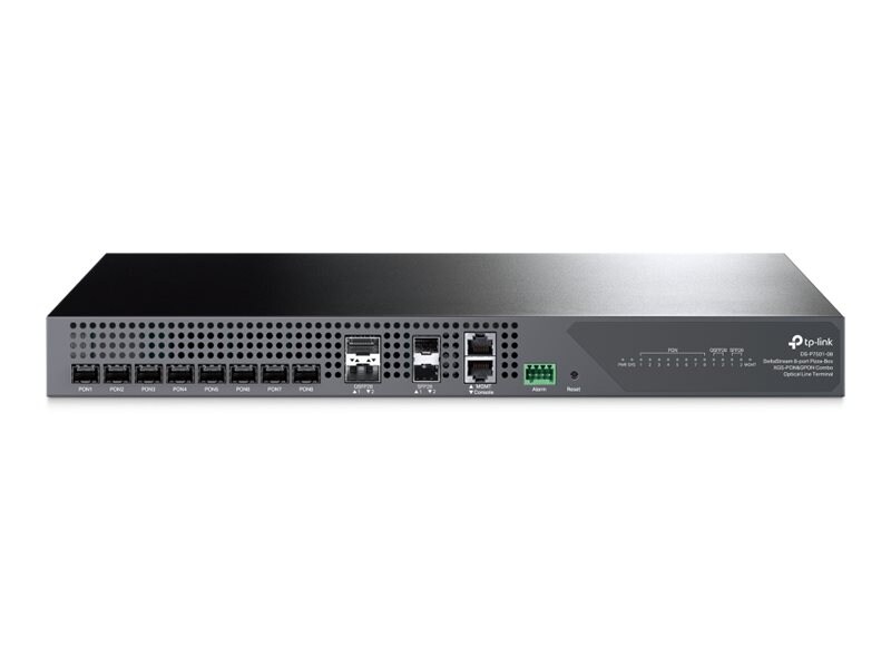 The TP-Link DeltaStream DS-P7501-08 V1 is a GPON terminal designed to deliver efficient network performance. With a maximum transfer rate of 100 Gbps, it supports a range of connectivity options including 25 Gb Ethernet and 100 Gb Ethernet. This rack-mountable device allows for reliable management through its interface that includes eight ports for management, GPON, console, and alarm, ensuring flexibility in connection.