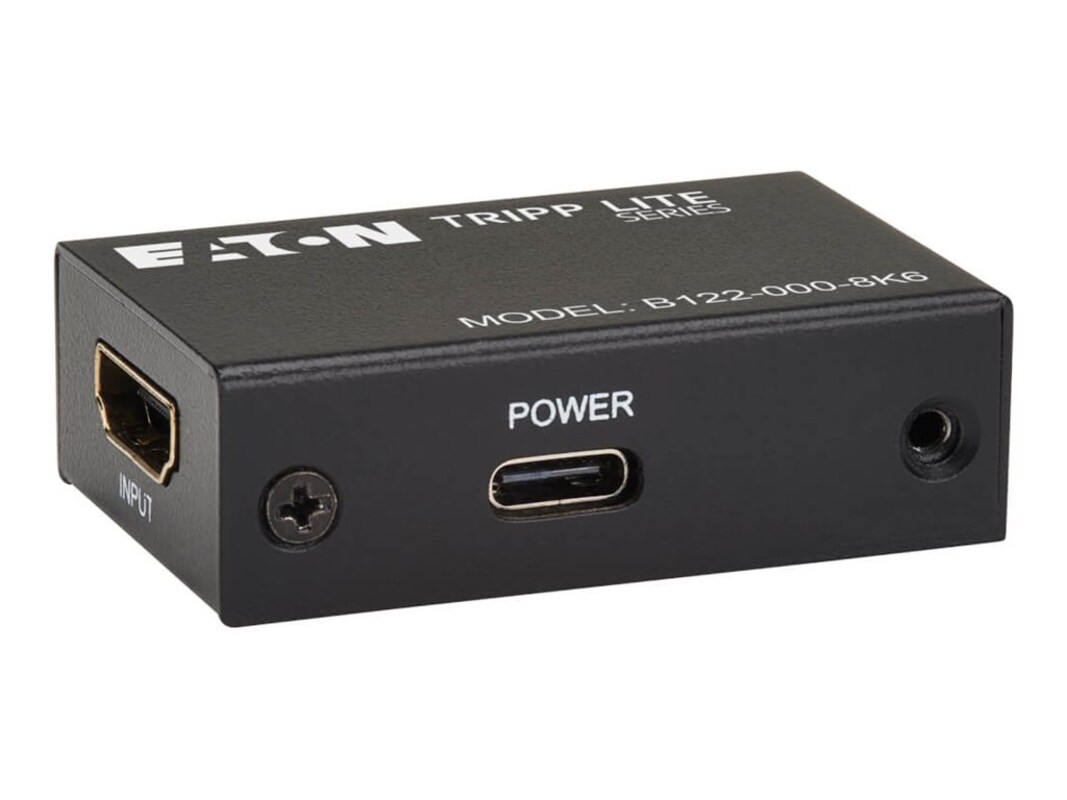 The B122-000-8K6 boosts HDMI 2.1 signals, including 8K/60 Hz, 4K/120 Hz and 1080p/240 Hz, over long distances using standard HDMI cables. The booster preserves signal integrity by maintaining full resolution, HDR and surround sound with no dropouts or degradation. It is recommended for digital signage or video presentations in schools, conference rooms, retail displays, trade show booths and anywhere else you need to display 8K video. It has been verified to work with major 8K/4K televisions and displays from Samsung, LG, TCL, Hisense and Sony. It also supports advanced formats such as VRR, ALLM and QFT.