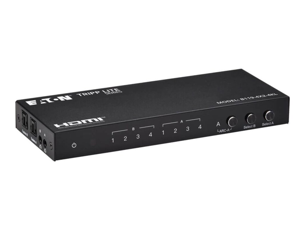 The B119-4X2-4KL is ideal for classrooms, retail displays and storefronts, hotel lobbies and restaurants, event venues, houses of worship, home theaters and other applications in which switching multiple sources to two displays is necessary. It connects up to four 4K video sources, such as laptops, media servers, cable/satellite boxes and gaming consoles, to two 4K displays.