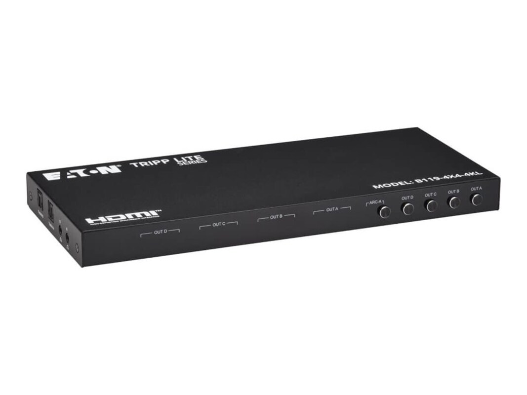 Audio can be output simultaneously to either the 3.5 mm stereo or TOSLINK ports and quickly switched via the included remote control. The B119-4X4-4KL supports compressed audio (DTS, Dolby Digital, DTS-HD Master Audio, Dolby TrueHD) and uncompressed audio (LPCM). The remote control allows audio from Output A and Output B to be extracted independently from each source for routing to external sound systems.