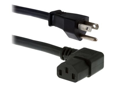 The most common household power cord is the NEMA 5-15P to C13 configuration. The three prong 5-15P end plugs into any standard wall AC outlet in the USA. The C13 receptacle can plug into standard computer equipment, printers, displays, TVs, or appliances that have a C14 inlet.