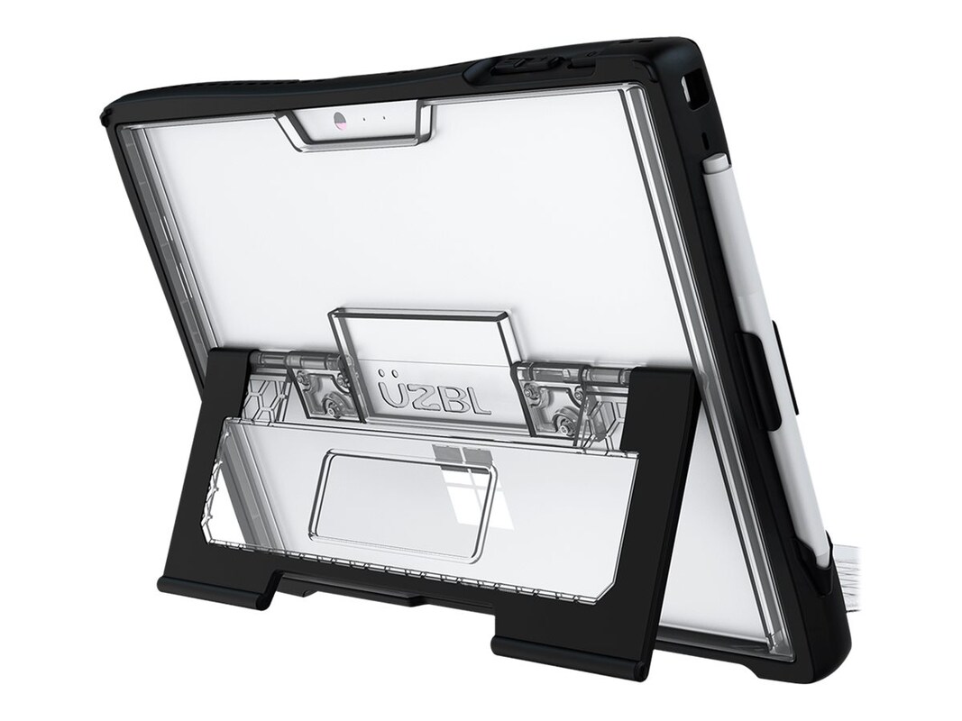 Designed for Rough School Environments. The UZBL Rugged Protective case was designed to protect the most important and expensive part to replace on the Surface Pro, the stand. The case features an independent stand that rotates 180 degrees onto either side of the case with TPU rubber edges for a no-slip grip. Composed of co-molded, translucent polycarbonate that protects from accidental drops and dings and allows for easy asset and barcode tag scanning. It features an easy lift lip to hold the Surfaces keyboard in place along with a convenient pencil holder.