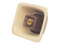 The Flexhorn is a one-way amplified horn speaker. Complete with speaker amplifier, built-in volume control and mounting bracket. The horn is weather proof and can be used indoors or outdoors in environments ranging from -4 to +131°F (-20 to +55°C). The Flexhorn may be mounted to walls using the supplied universal bracket; mounts to steel "I" beams using the supplied "C" clamp or flush mounted in a wall.