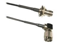 This coaxial cable assembly uses 18 inches of TWS-100 antenna extension cable. This cable jumper assembly connects a right angle RP-TNC male (female center pin) to a RP-TNC long bulkhead female (male center pin).