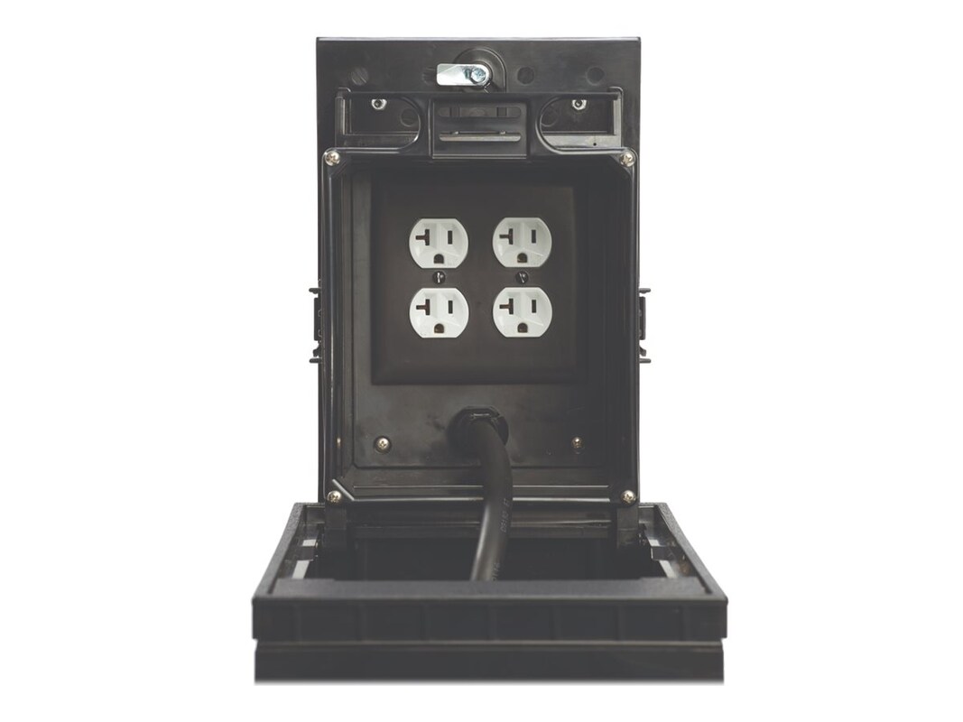 The black Outdoor Ground Box cover assembly is prewired on a single circuit with (2) 20A weather resistant duplex receptacles.